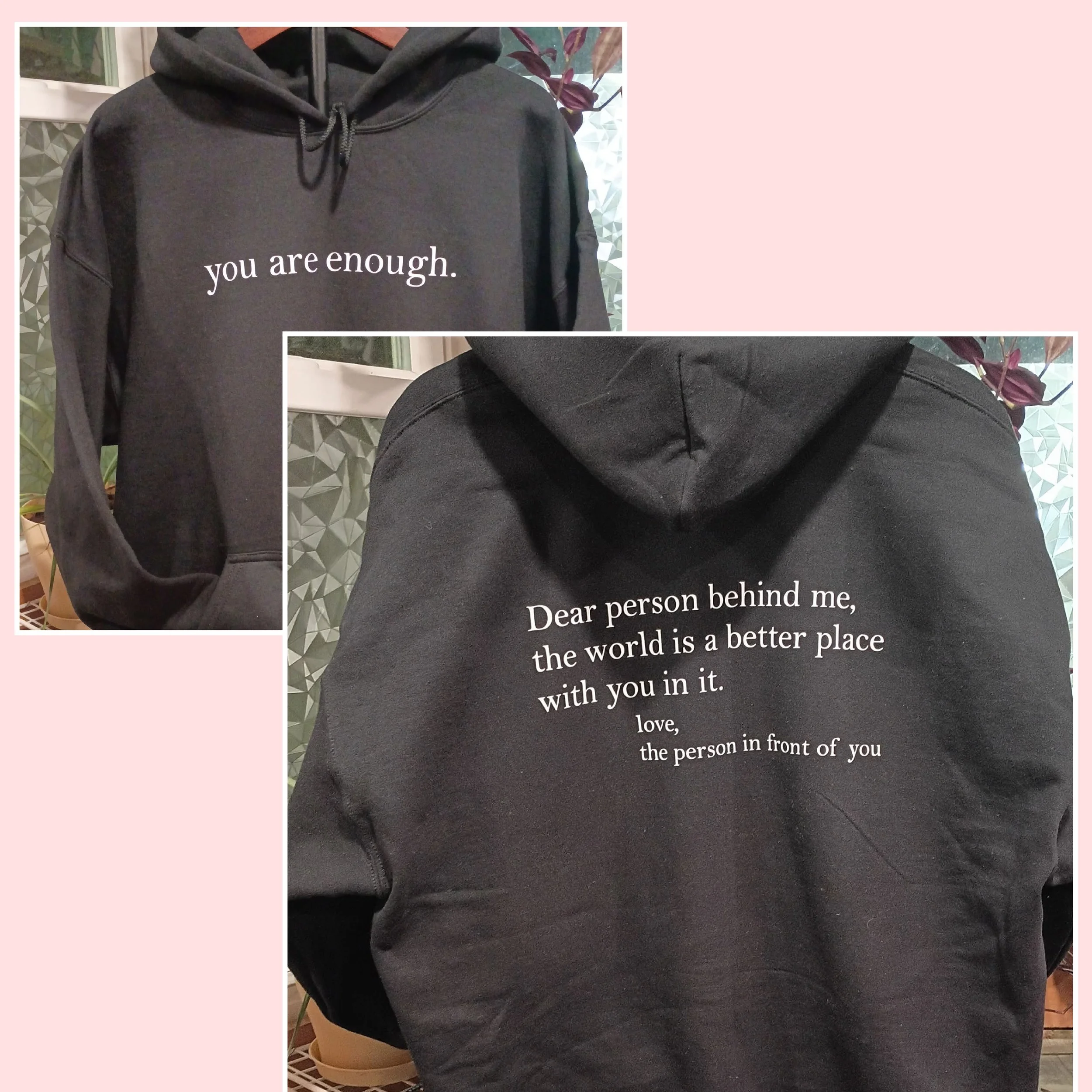 Cozy up in comfort while sharing a message that matters. This sweatshirt features and uplifting design - ‘you are enough’ - on the front and a heartfelt message on the back - created to inspire both you and those around you.